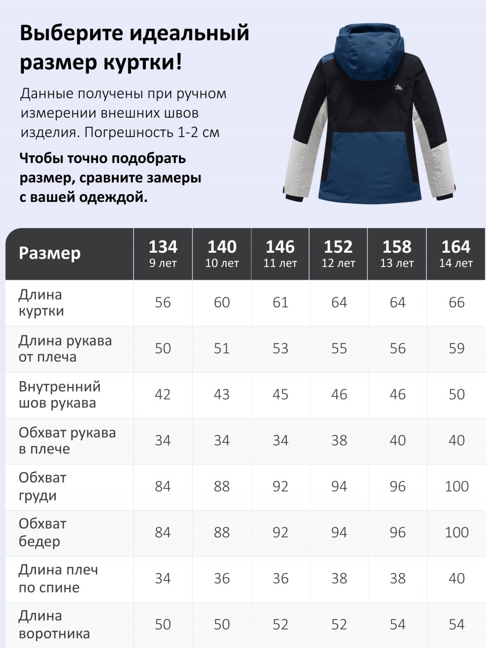 Размер Длина куртки Длина рукава от плеча Внутренний шов рукава Обхват рукава в плече Обхват груди Полуобхват бедер Длина плеч по спине Длина воротника
