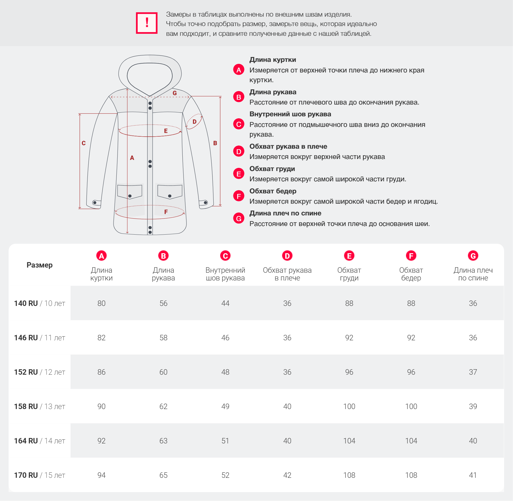 • A Длина курткиИзмеряется от верхней точки плеча до нижнего края куртки.