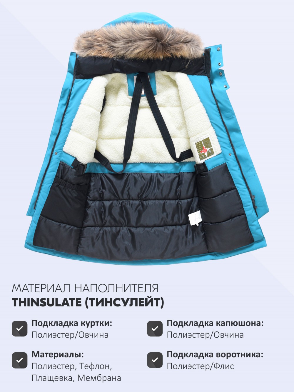 Внутренняя подкладка из овчины, полиэстера и флиса делает модель особенно уютной и приятной к телу. Капюшон несъёмный, он плотно прилегает к голове и дополнительно защищает от непогоды. Опушка из натурального меха енота на молнии при желании легко снимается. Стояче-отложной воротник надёжно закрывает шею и обеспечивает защиту даже без шарфа.